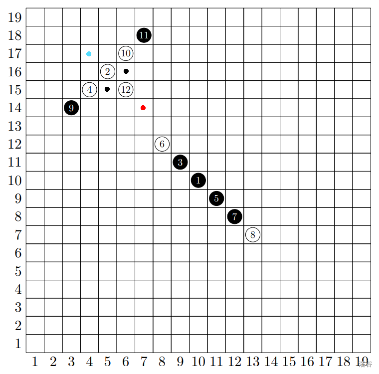 此时,可以计算出红点的分数增加量超过 ,黑点和蓝点的分数增加量均为 (其中 表示由单个先手棋子带来的贡献),所以先手会一定会选择红点。我们可以在两个黑点中任选一个,这样我们会形成一行三个棋子相邻,先手会在某一侧防守。接下来我们在另一个黑点旁边的位置下子,先手会下在那一行三个棋子的另一侧。然后我们下在另一个黑点上,形成一个十字。一种可能的情况如下: