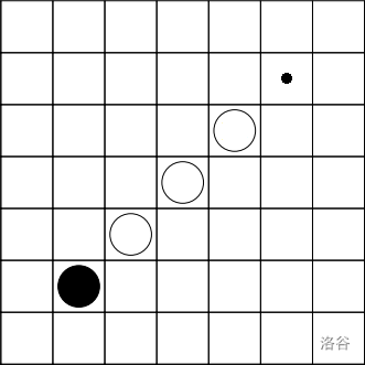 此时先手会在后手两个子所在的那一行,相邻的两侧之中的一侧下子。无论先手选择哪侧我们都下在另一侧,这样会形成上面所说的情况,引诱先手“浪费”一手。我们选择在中间那个子另一个对角线方向相邻的位置下子,如下图: