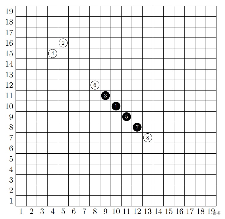 我们的前两手选择一个远离中心,又不太接近边界的地方,在两个对角线相邻的地方下子,例如 和 。根据上面的优先级,先手会选择靠近其中心第一个子的位置下子,并连成一行。此时,先手会在中心形成一行相邻的三个子。这时我们需要防守,在这一行相邻两侧的任意一侧下子。先手会下在另一侧,我们继续防守,下在这一侧相邻的位置。一种可能的情况如下图所示。