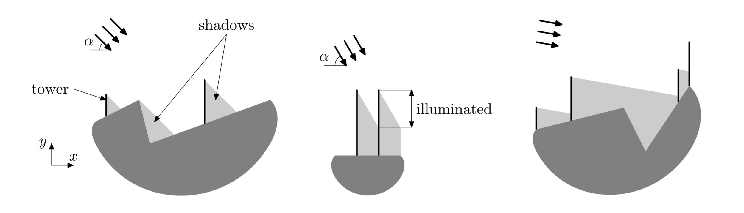 考虑将所有塔被光照到的部分沿着光线平移至 处,那么塔 就在这条线的最高处,并且不难发现,此时最多能被覆盖的长度即为这条线的最高处到 之间的长度,即存在一个显然的上界为:$\min\{(x_j-x_1)\tan \alpha + y_j - y_1 + h_i,\sum_k h_k\}$,不难发现这个上界是可以取到的,我们只需要先确定最高点后贪心填就可以了。