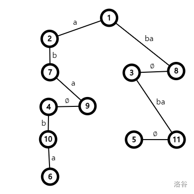 其中 表示的是空串(也就是这两个点应该是在一起的,只是为了方便拆成两个点),点 至 对应是 parent 树上的点, 至 对应是因询问而插入的点。这里为了方便,对于每一次询问都新建了一个点。这样并不会导致复杂度变劣。