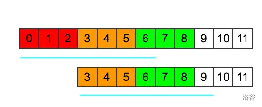 同理,由于橙色和绿色相等,那么红,橙,绿都相等,也就是说长度为3的循环节,至少可以循环3次。这里可以看出,蓝线的长度,除以循环节的长度再加1,就可以算出来最多可以循环几次,如果不能整除,向下取整。这个例子里面就是,那么可以取种。
