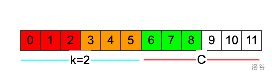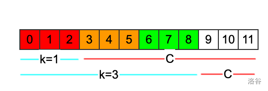 当循环节长度是的时候,至少可以取到,就是只循环一次,后面剩下的都给。除此之外,k还可以取多少呢?不妨以为例,画一个图看看