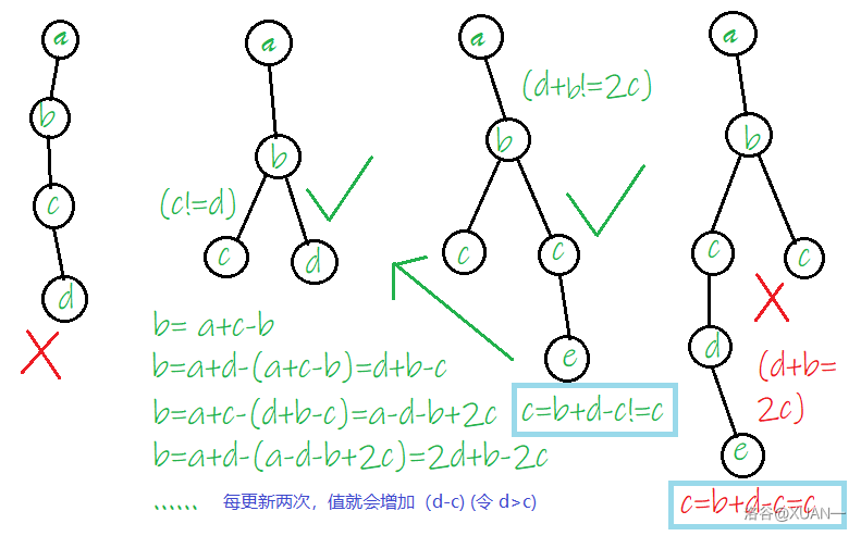 到底什么情况下才是正无穷呢?根据样例不难发现,如果一个可操作节点拥有两个值不相同的儿子,那么反复操作,答案就会不断累加,可以达到正无穷。显然地,一条链是无法变成+inf的,尝试手动模拟一下就会发现,点权值只能随修改反复横跳。