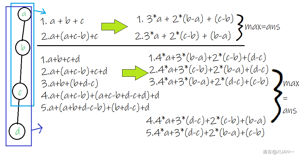 (确实不是人能想出来的),但显然,最终答案是一个固定的序列——以儿子减父亲的值作为一项,各项系数分别为 至 ,贪心地把较大项的系数给到更大即可。(显然和大佬们的差分是等价der)