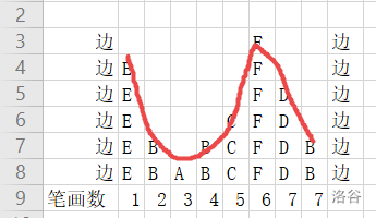 - 对于下山时,如果楼梯已经在西坡(也就是上山楼梯)出现过,笔画不增加,如果没出现过,笔画增加。