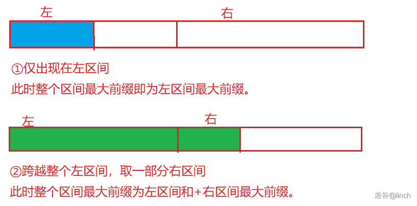 分类讨论,可能只取左区间一部分,此时合并后最大前缀即为左区间最大前缀 。也有可能跨越了整个左区间,此时最大前缀为左区间和 加上右区间最大前缀 。可写出式子 。