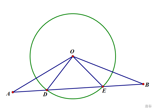else if(fabs(det(OA,OB))>=r*DAB||dot(AB,AO)<=0||dot(BA,BO)<=0){ if(dot(OA,OB)<0){ if(det(OA,OB)<0) return (-acos(-1.0)-asin(det(OA,OB)/DOA/DOB))*r*r*0.5; else return (acos(-1.0)-asin(det(OA,OB)/DOA/DOB))*r*r*0.5; } else return asin(det(OA,OB)/DOA/DOB)*r*r*0.5; }- 两边在圆外,且 与圆相交