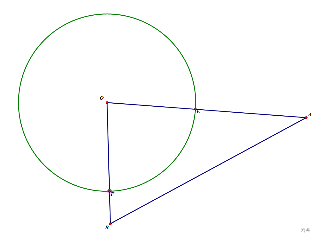 else if(DOB<r&&DOA>=r){//情况二 double x=(dot(BA,BO)+sqrt(r*r*DAB*DAB-det(BA,BO)*det(BA,BO)))/DAB; double TS=det(OA,OB)*0.5; return asin(TS*(1-x/DAB)*2/r/DOA)*r*r*0.5+TS*x/DAB; //这里比较难,要好好理解一下 } else if(DOB>=r&&DOA<r){ double y=(dot(AB,AO)+sqrt(r*r*DAB*DAB-det(AB,AO)*det(AB,AO)))/DAB; double TS=det(OA,OB)*0.5; return asin(TS*(1-y/DAB)*2/r/DOB)*r*r*0.5+TS*y/DAB; //同上 }- 两边在圆外,且 与圆不相交