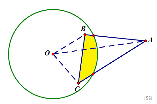 $$BD=\dfrac{\vec{OB}\cdot\vec{BA}+\sqrt{AB^2r^2+(\vec{BA}\times\vec{BO})(\vec{BA}\times\vec{BO})}}{AB} $$再来计算扇形的面积,问题又转化为求