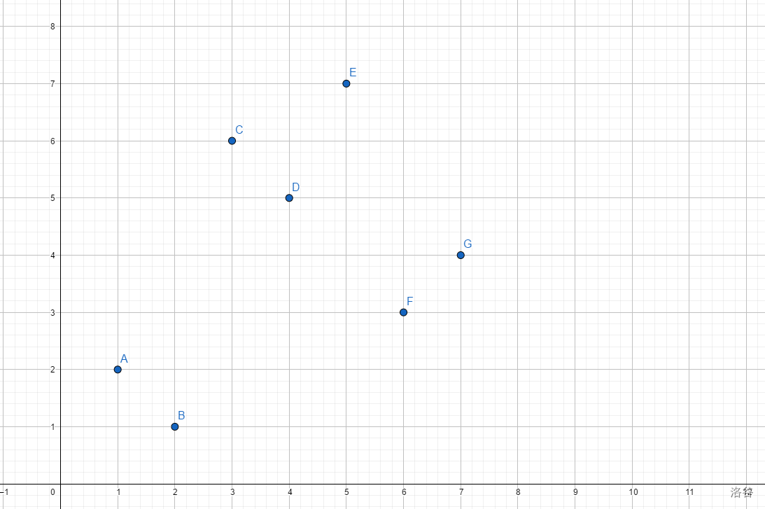 我们把题目所给的序列中的每一个元素按照下标和值表示成一个点对,然后建立平面直角坐标系( 为下标, 为值,这里以样例 举例):