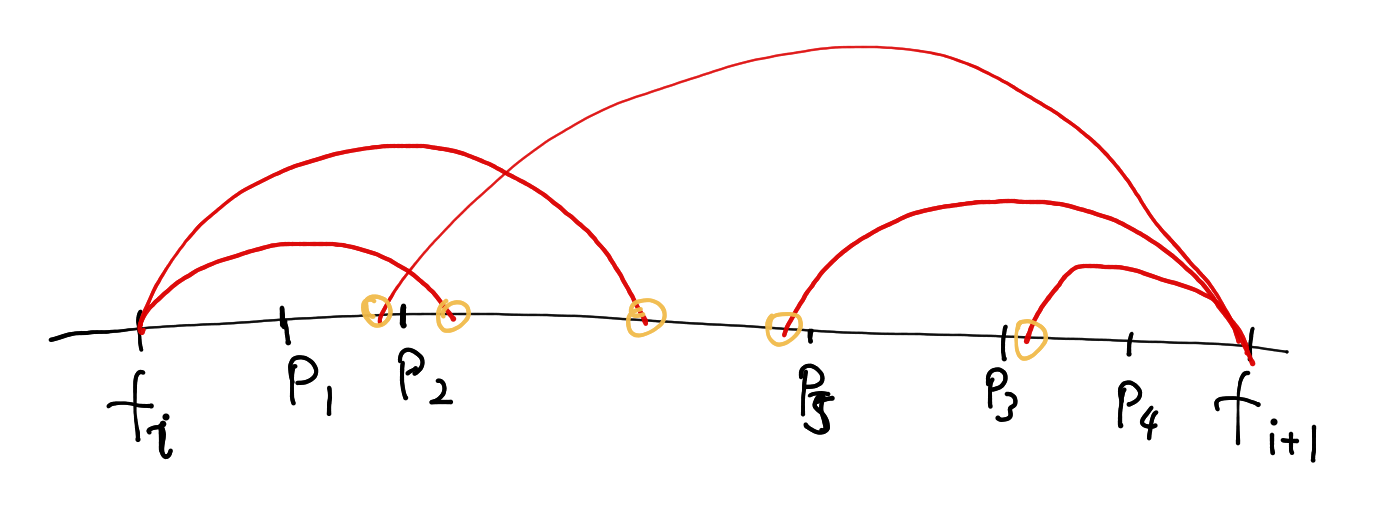 先发现一个结论,就是每个区间内部最多放两头牛,就能占掉所有的草。比如下图中所有的草用 表示,我们只需把自己的牛放在 和 的位置,就能收获所有这个区间内的草。也就是说,每个区间最多放两头牛。