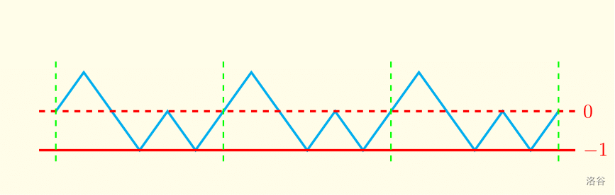 这张图对应的 。容易发现,如果左括号数目和右括号数目相同,那么折线就会出现循环节,并且总是能在一个循环节里找到一个最低的位置。那么再选定无穷次循环后的折线的最低点,它们之间形成的括号序列就是无限长的合法括号序列。