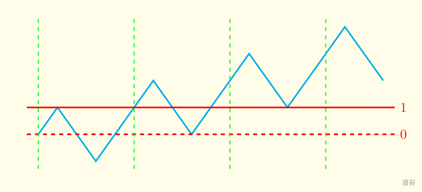 这张图对应的 。容易发现,如果左括号数目和右括号数目不相同,那么整条折线就会有向上/向下的趋势(每次循环后,折线总体的高度至少改变一个单位)。那么我们无论如何是找不到一条线段能够经过无穷个折线的,因此必然不合法。