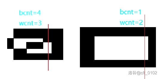 这是不行的。考虑下图左边的情况,扫描线扫到下一个右边缘后,上下两边的黑色块“合并”了,导致之前计算为两块的黑色块实际上是一块,所以 此时应该自减 。
