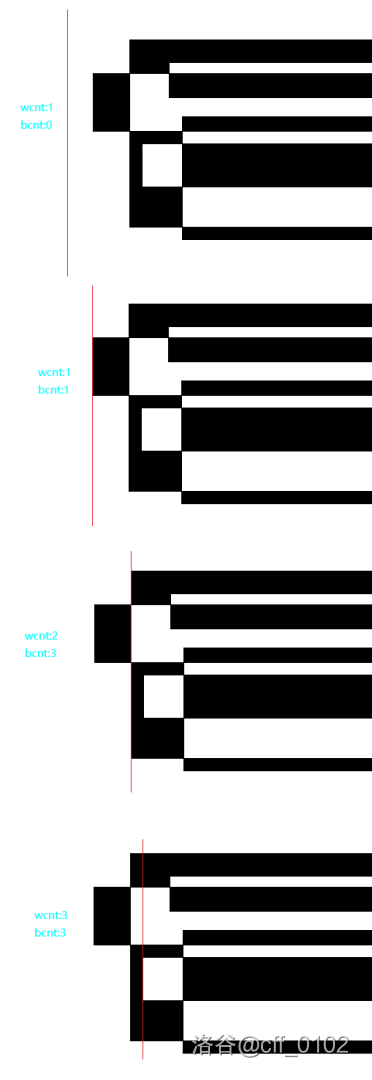 扫描到一个左边缘时,可以知道这条边缘覆盖的范围。它实际上的作用是对扫描线上这段范围的颜色取反,或者说异或了 。但是我们只管答案,可以发现只要知道线扫过去之后右边改变了几块的颜色,就可以对应更新答案。比如上图的扫描线扫到第二个左边缘时,多出现了从上至下的黑、白、黑三块,所以就要将 增加 ,将 增加 。