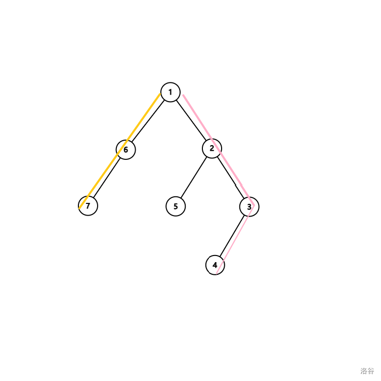 我们可以考虑每一个节点 ,假设树中的直径经过 且在 子树中。那么树的直径长度应为: 子树中到达 的最长路 子树中到达 的次长路。如图,粉色路径与橙色路径可以构成一条直径: