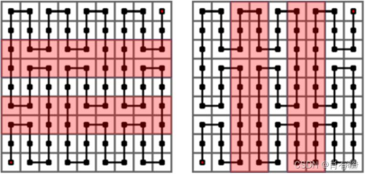 例如,对于 阶皮亚诺曲线中相邻的格子有 个,若将 阶皮亚诺曲线看成由 个 阶皮亚诺曲线组成,则每个 阶皮亚诺曲线内部相邻的格子有 个,两个 阶皮亚诺曲线的水平方向上相邻的格子有两行,每行 个格子,垂直方向上相邻的格子有两列,每列同样 个格子。如下图所示。也就是 阶皮亚诺曲线中相邻的 个格子可以分解为 。