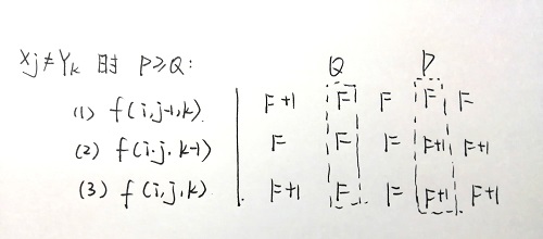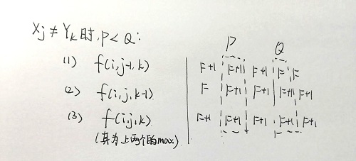 $$(p(k,j),q(k,j))=\left\{\begin{matrix} (P,Q) & X_j\neq Y_k,P\geq Q\\ (Q,P) & otherwise \end{matrix}\right. $$初始 ,将 都递推出来后再处理原问题只需用差分得到 。